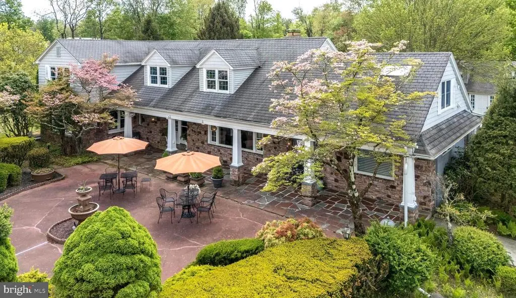 TWO HOMES ON 5 PRIVATE ACRES. With the same owners for almost 60 years, this is a rare opportunity to own a multi-residential estate in the heart of Bucks County. Perched on the Palisades overlooking the Delaware River valley, this lovingly maintained property features two unique homes: an elegant main house with three bedrooms and a whimsical mid-century modern guest house. The main residence has been renovated by its current owner to create a study in elegance, artfully blending the home’s old-world charm with a multitude of modern comforts. The Carrara slate tiled foyer connects the home’s three main living spaces. To the left is a state-of-the art kitchen with quartz countertops, generous custom cabinetry, and all newer stainless-steel appliances, including a commercial-sized side-by-side refrigerator, a wall-mounted KitchenAid dual oven and microwave/convection, an induction cooktop, a retractable kettle faucet, and a Miele cooktop grill. The spacious center island boasts a KitchenAid dishwasher, a wine fridge, a double-wide stainless-steel sink, and built-in wine shelving. To the left of the foyer is the light-filled living room, with a grand stone fireplace and a large picture window overlooking the courtyard. Joining the kitchen and living area is the spacious dining room with views of the back patio – ideal for outdoor dining and entertaining. Beyond the living room is the main-floor bedroom featuring another picture window to the courtyard, a sitting area, and a full bath with walk-in shower. Rounding out the first floor, there’s a flexible space that’s currently being used as a music room/bar, a powder room just off the main entrance, a walk-in pantry, a mudroom with access to the back yard, and a laundry room. Upstairs is the private parlor/library, featuring stunning views of the surrounding countryside, beautiful custom-built cabinetry and bookshelves, a decorative fireplace, and an adjacent wet bar. Down the hall is a cozy guest bedroom with built-in cabinetry, an office space, and a hall bath with shower/tub. The private principal wing includes another decorative fireplace, a sitting area, plenty of built-in cabinetry, a dressing room, and a recently renovated principal bath that’s a true retreat, with a glass walk-in shower, a dressing table, and two skylights for plenty of natural light. Moving back outside, a landscaped path leads to another building that includes an oversized two-car garage on one side and an unfinished two-level space on the other. Ideal for additional storage, this second “cottage” could easily be transformed into a separate home office, workshop, artist’s studio, or even extra living quarters. Finally, tucked away at the far end of the property is a delightful mid-century bungalow brimming with character and warmth. Whether used as a guest house, writer’s getaway, or rental home, this charming second residence offers privacy and comfort, with its own kitchen, spacious living area, bedroom and bath. The entire property is surrounded by nature (it’s just one mile to Ringing Rocks State Park and two miles to the Delaware River and Canal path), yet it's only minutes to all the eclectic shops and fine restaurants of Milford and Frenchtown and just an hour and 15 minutes’ drive to New York City. Don't miss this unique opportunity to own two homes in one exceptional setting!
