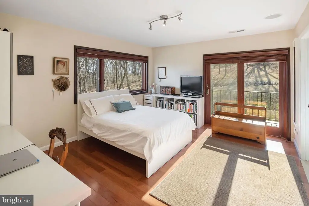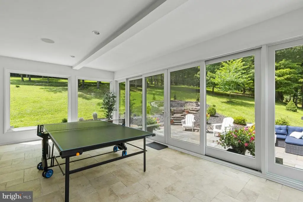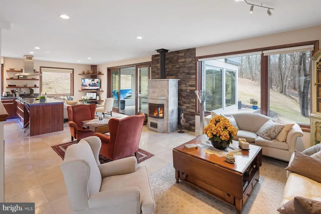 Built with a significant emphasis on quality and sustainability, the European-influenced "San Souci" is offered for the first time. Convenient to Newtown, Yardley and New Hope, this home is a world away from typical newer construction, this privately situated, custom residence is on 5.9 acres high above the historic Delaware River canal, perfectly located for walking and bicycling as well as for easy access to Princeton, Philadelphia, and train service to New York and beyond. Step inside this LEED-certified home and feel how open and light-filled the entire main living level is. Custom Andersen windows and doors galore frame views and let the sunshine in on timeless marble floors. A Canadian-built soapstone wood-burning fireplace can warm the living space for hours, supplemented by the home's efficient geothermal and solar systems with hot-water radiant tubing in place beneath most of the home's floors. The open plan is flexible and smartly designed with spaces for dining, including a charming hidden breakfast nook, seating areas, a private home office, a four-season sunroom with fireplace and a stunning kitchen. Designed for the serious cook, the kitchen has storage galore with a walk-in pantry closet and custom Amish-made cabinetry, professional-grade Thermador appliances (two full-size wall ovens, warming drawer, 48" gas cooktop with powerful ventilation hood, refrigerator/freezer, dishwasher), wine chiller, built-in microwave/convection and a large island topped in a single sheet of granite, all lined in fun LED rope lighting. Whether for daily needs or special occasions, this kitchen will perform quite capably, and the cook will appreciate the views. This home has a remarkable amount of indoor-outdoor flow, including access to a deck with built-in seating and BBQ space just off the kitchen, a large corner veranda off the dining area and a patio with built-in firepit and seating off the sunroom. And that is just the first floor. The open central stairwell, where there is plenty of gallery-style wall space for art and a skylight, leads to private quarters on the second floor. An owner's suite with a large private balcony and ample space for a seating area includes a large bath with extra-deep steeping tub, oversized two-person shower and two wall-hung vanities plus three closets, including walk-in with built-ins. A second en suite bedroom with private balcony, bedroom with access to a hall bath, and fourth bedroom with a fun "a-ha" entrance and its own full bath complete the upstairs. All bedrooms have hardwood floors and plenty of windows for natural light. A full laundry room with laundry chute is on the first floor and includes generous storage. The finished lower level provides a home theater with built-in sound system and tiered seating, a full gym, full bath and space ready to become your wine cellar. Utility rooms and a four-car garage complete this level. To support the LEED living environment, this home has a Honeywell air filtration system, cistern for collecting rainwater for gardening/car washing, well water treatment system, whole-house vac, plus the security and comfort provided by a whole-house generator. "San Souci" is an ideal residence for the buyer seeking a thoughtfully designed house offering privacy, home office and recreation spaces, and an ideal location just a few minutes from I-95.
